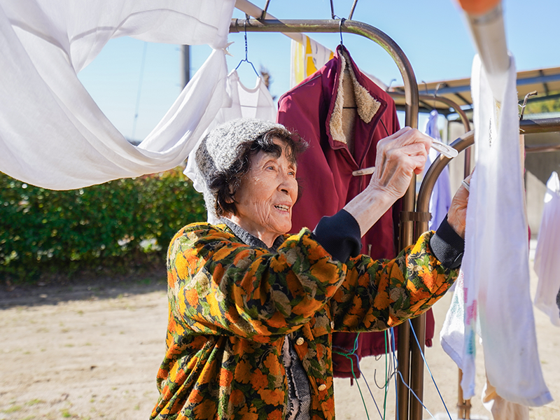 洗濯機を使って洗う、屋外の物干しに洗濯物を干す、乾いた洗濯物を取り入れて畳むなどの一連の動作を、役割として楽しく行います。