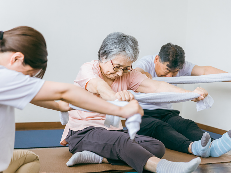 筋力・柔軟性・関節可動域の維持・向上を図り、無理なく全身を動かします。暮らしの中で求められる動作の安定性と滑らかさを養います。