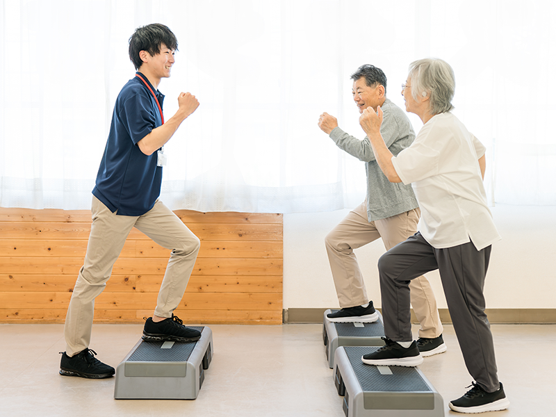 踏み台を昇り降りする動作を繰り返しながら、足腰の筋力とバランスを高め、段差への自信と安定性を育み、階段でのふらつきやつまずきを防ぎます。