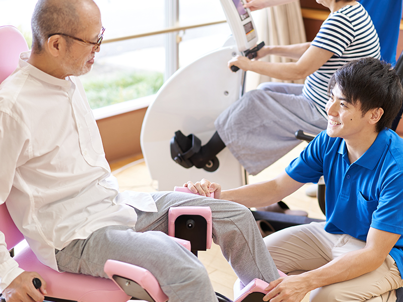 専用マシンを使って下肢の筋力を集中的に鍛え、立ち上がりや踏み出しなどの動作を安定させ、日常生活の自立度向上を目指すトレーニングを行います。